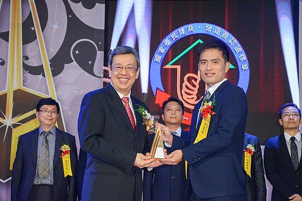 晚間七點,國家品牌玉山獎頒獎典禮準時揭幕,景富莊柚木家具郭奇峰副總上台領取獎項,從副總統陳建仁先生的手中接過最佳產品獎,令公司全體同仁與有榮焉。