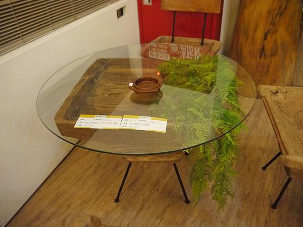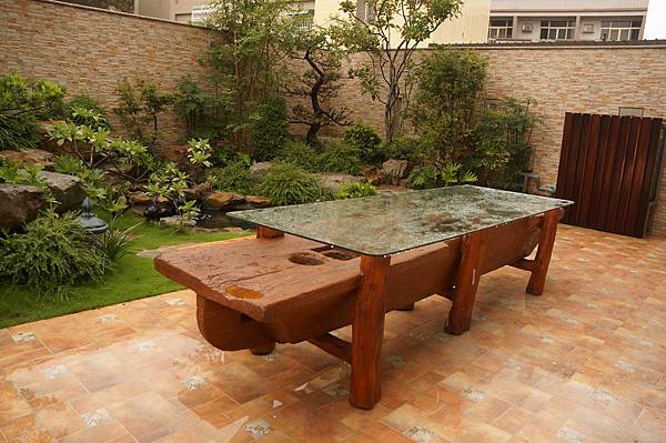 景富莊的風化米槽茶几,材質為老柚木,因木頭含有油份、木質強韌、耐久性高、蟲害抵抗力佳,適合久放戶外,有相當高的安定性。建議米槽內可種植花草或養殖小金魚,上蓋以玻璃,透著陽光看下去,就像是欣賞一幅畫般,充滿詩意。